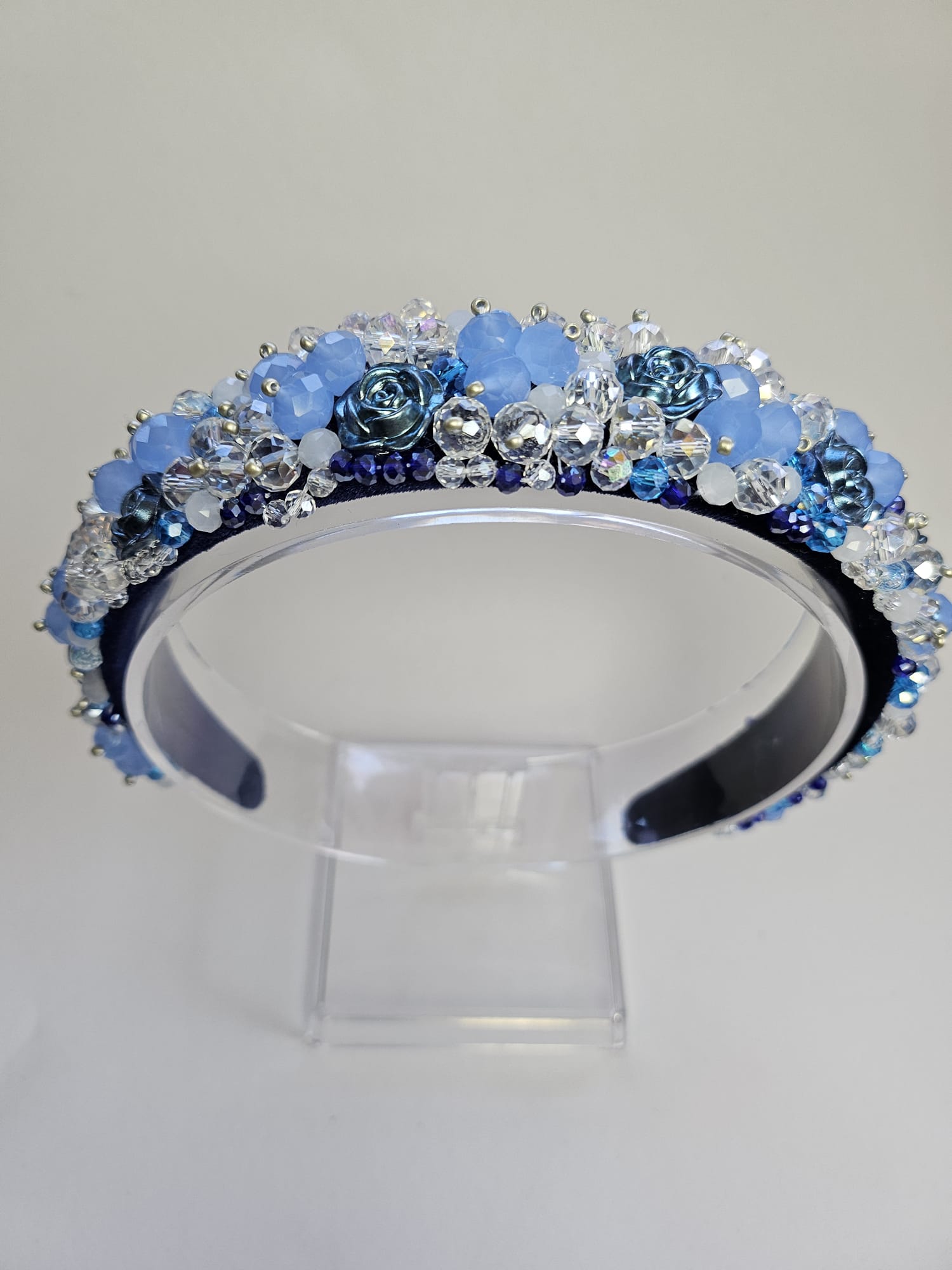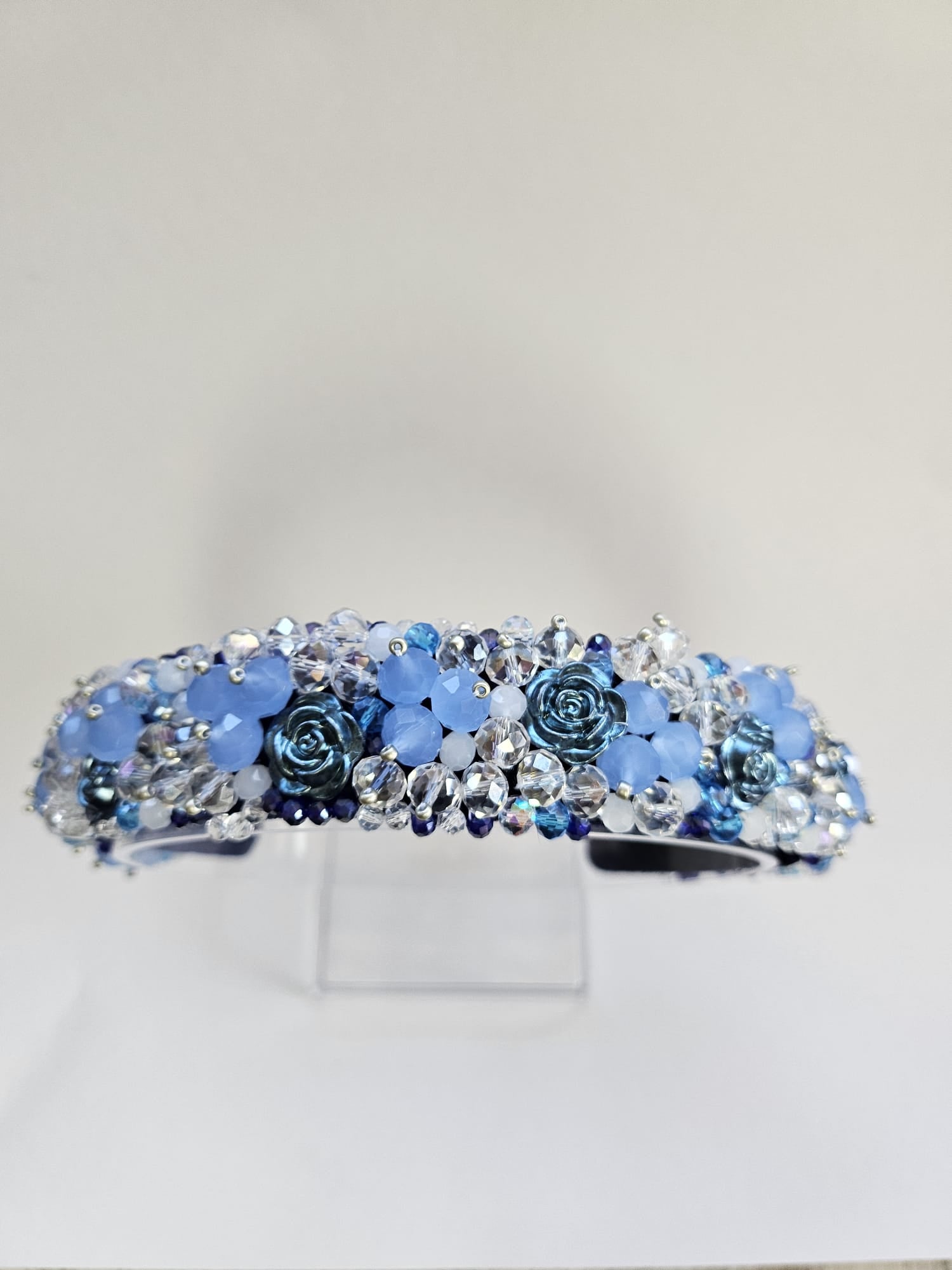 Îmbogățește-ți coafura cu această cordeluță lată unicat, realizată manual, care combină cristale delicate în nuanțe de alb transparent și albastru cu flori acrilice albastre, creând un efect spectaculos și rafinat. Designul original și dimensiunea de 3–5 cm o fac potrivită pentru orice tip de coafură, adăugând un strop de eleganță și prospețime fiecărei ținute.