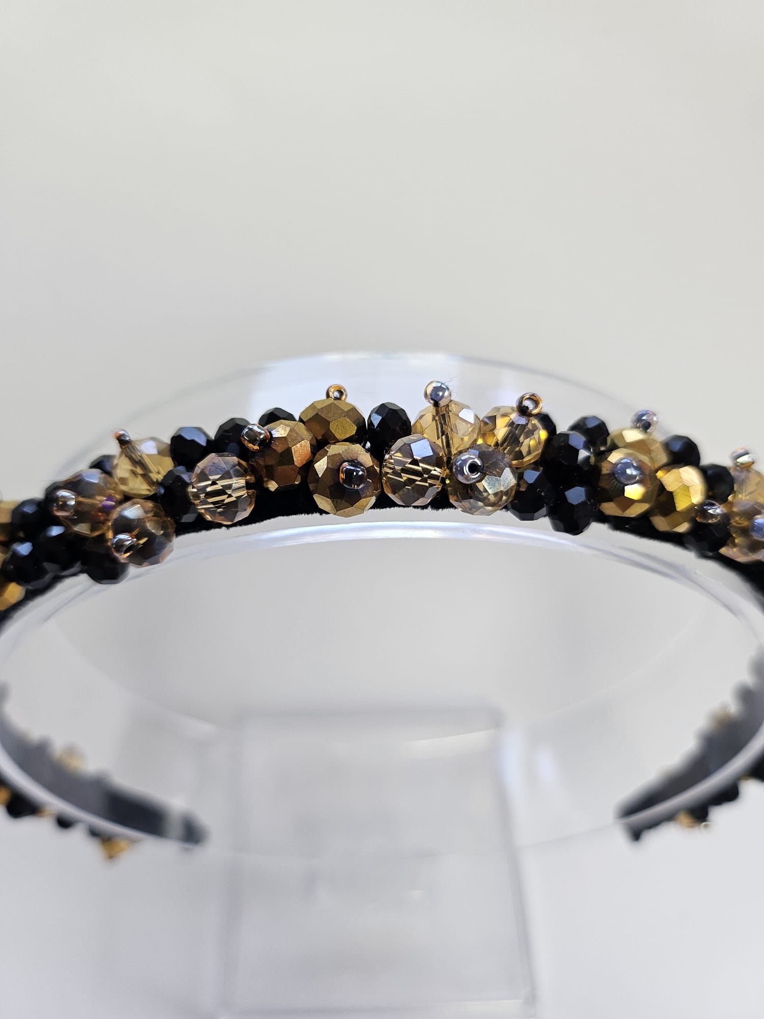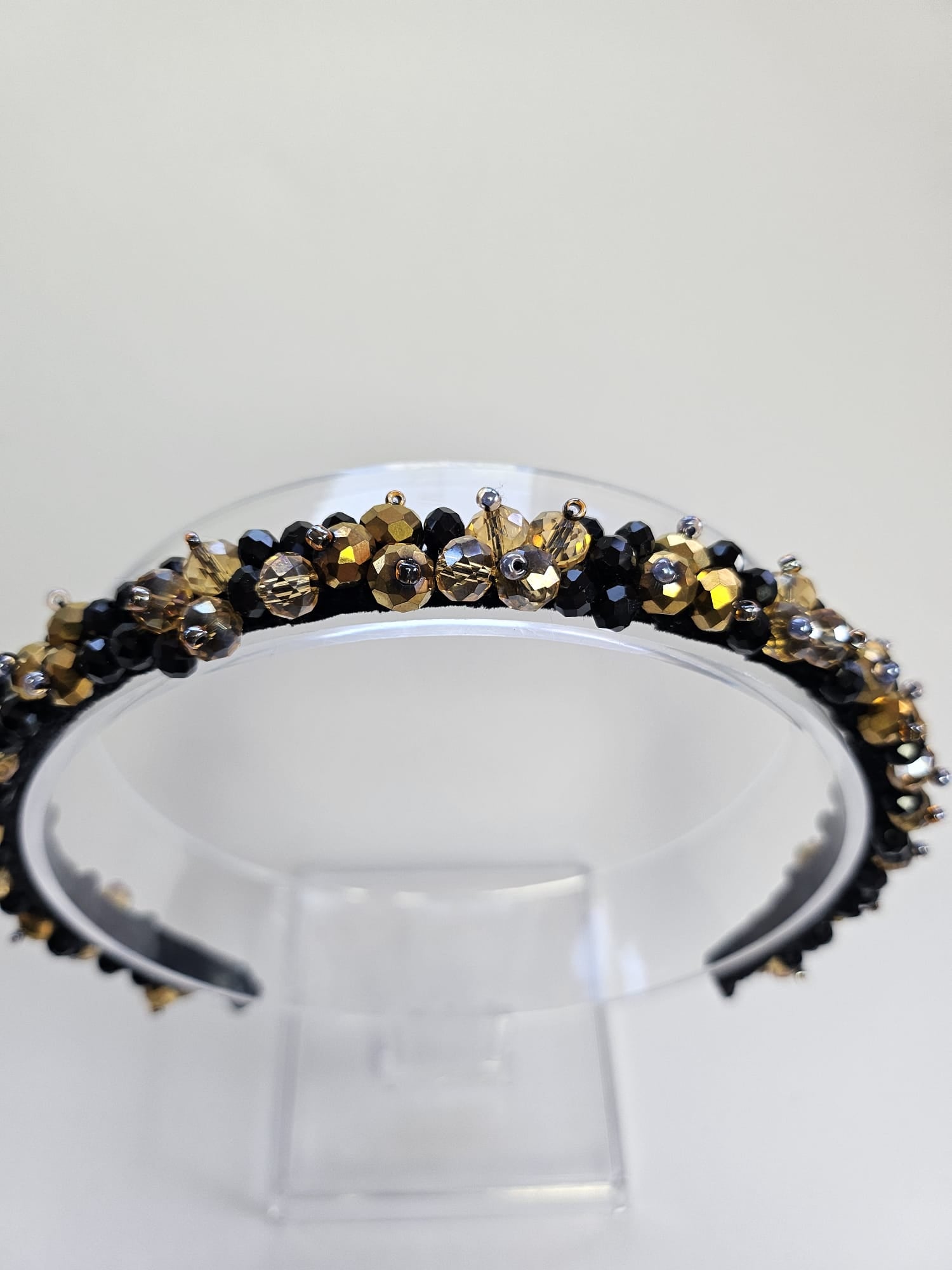 Adaugă un plus de eleganță și mister ținutelor tale cu această cordeluță unicat, realizată manual din cristale negre și detalii aurii. Combinația sofisticată de nuanțe oferă un look luxos și versatil, potrivit atât pentru ținutele de zi, cât și pentru aparițiile speciale de seară.