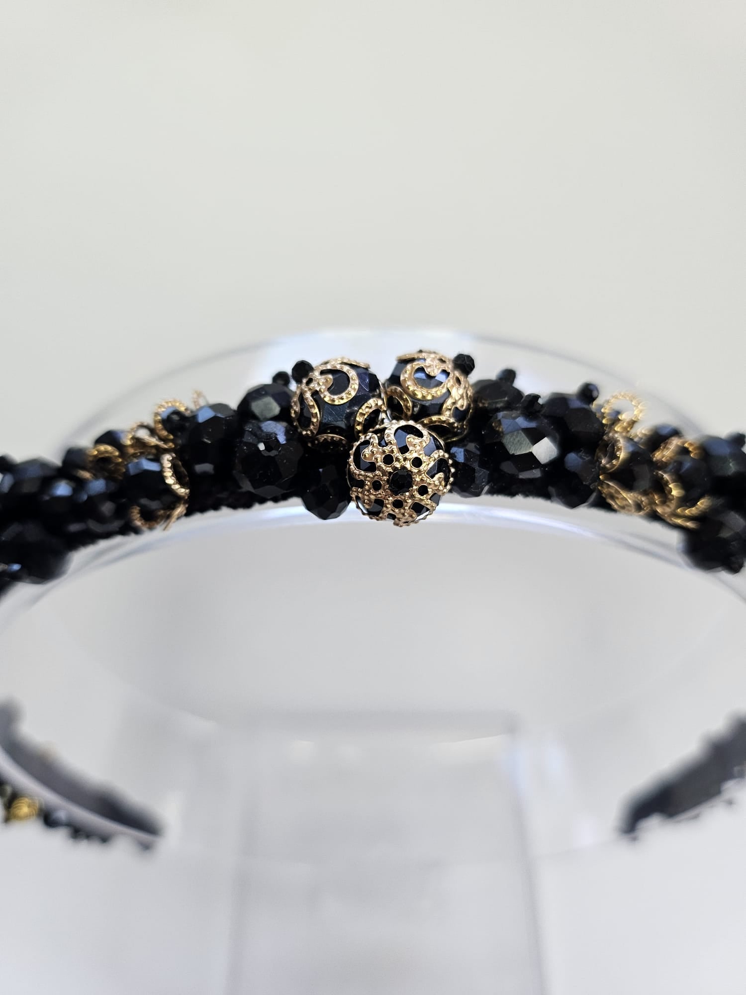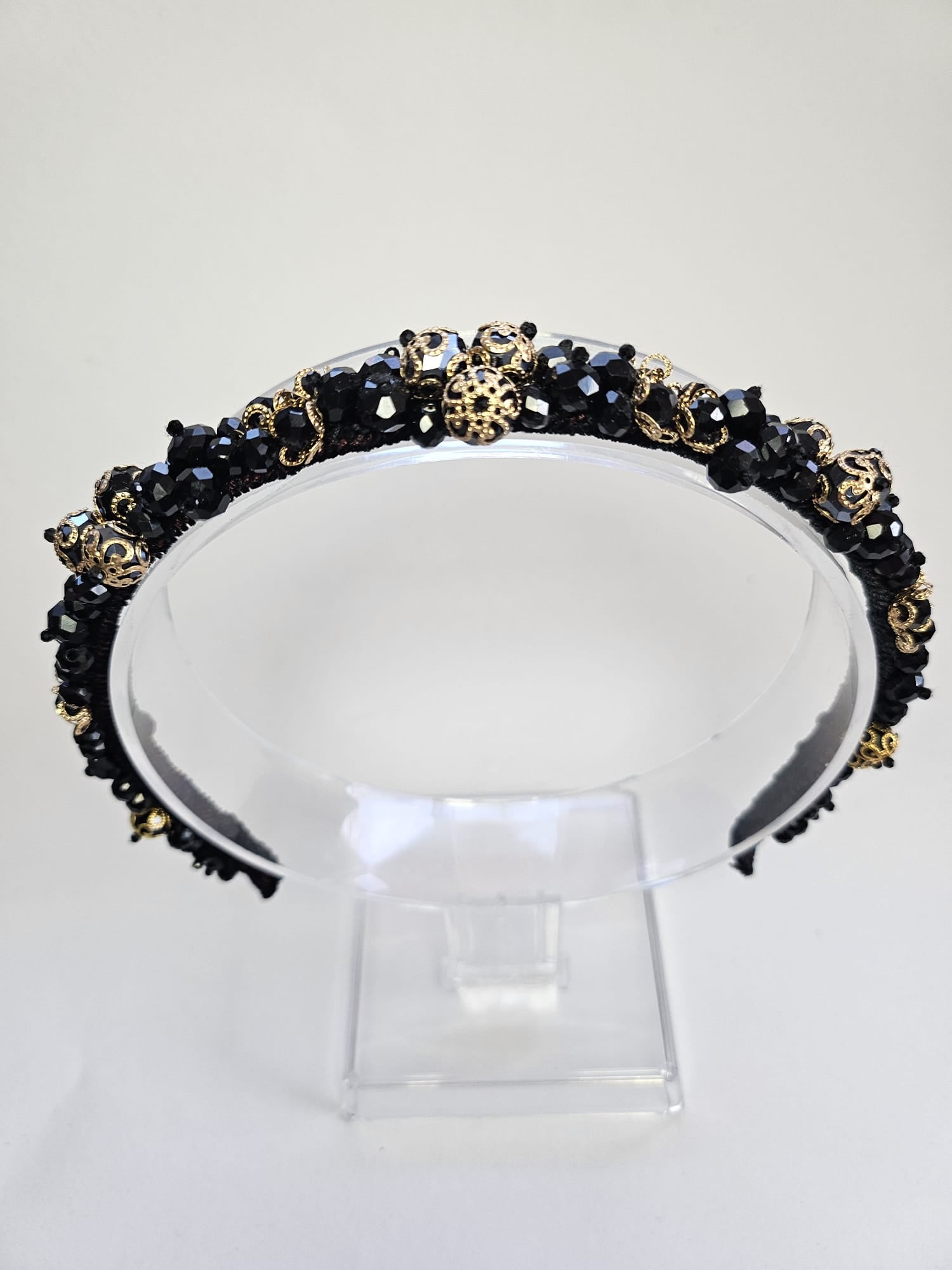 Această cordeluță delicată este un accesoriu elegant, creat pentru a adăuga un plus de stil și strălucire oricărei coafuri. Realizată pe o bază metalică subțire și flexibilă, piesa este decorată cu cristale negre strălucitoare și mici elemente în nuanțe aurii, care oferă un contrast sofisticat și un aspect modern.