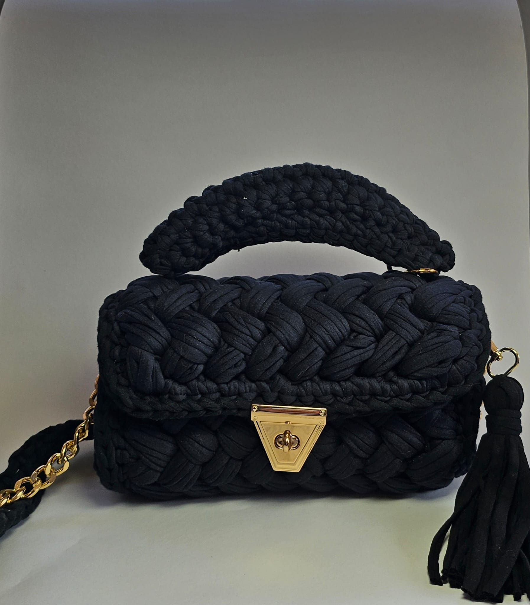 Geanta este realizată din fir panglică premium KaDi Medium, grosime 7–9 mm, 100 % bumbac negru de calitate superioară, moale și uniform pe toată lungimea, certificat Oeko‑Tex Standard 100 pentru siguranță și durabilitate. Acest fir este recomandat special pentru proiecte croșetate handmade, precum genți și poșete, oferind rezistență și un aspect profesional lucrărilor tale.